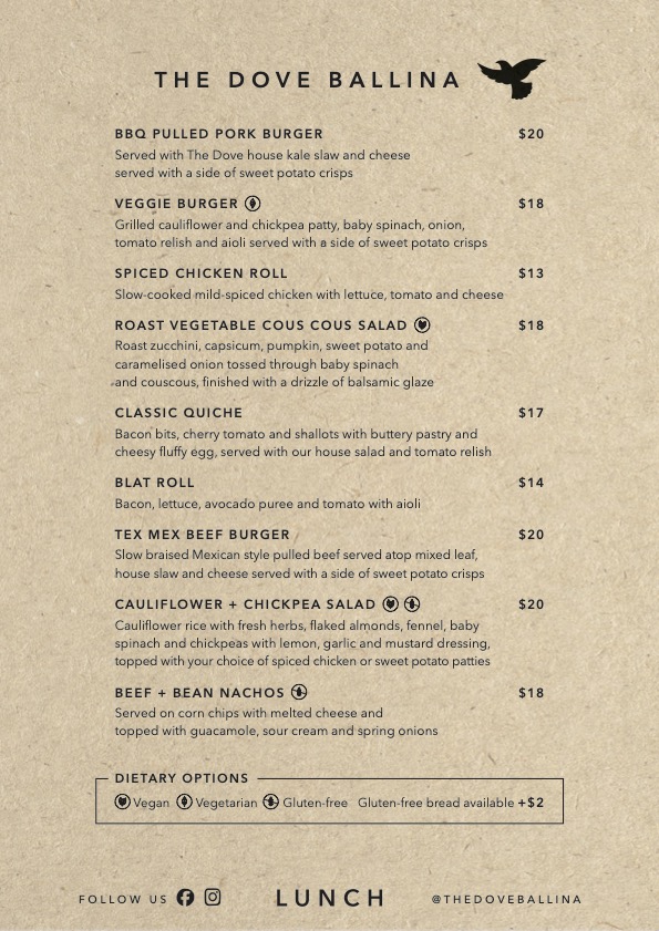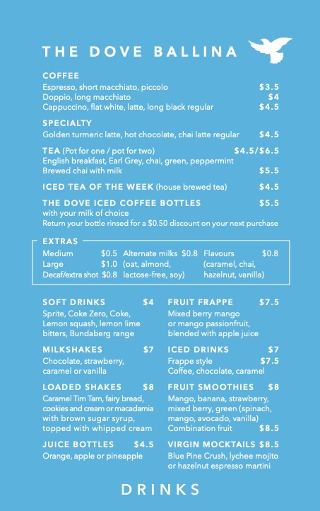 The Dove Ballina Menu