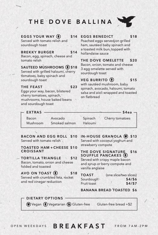 Welcome to The Dove Ballina, a charming café nestled in the heart of Ballina, NSW. This delightful spot offers a menu that celebrates quality ingredients and friendly service, making it a favorite among locals and visitors alike.